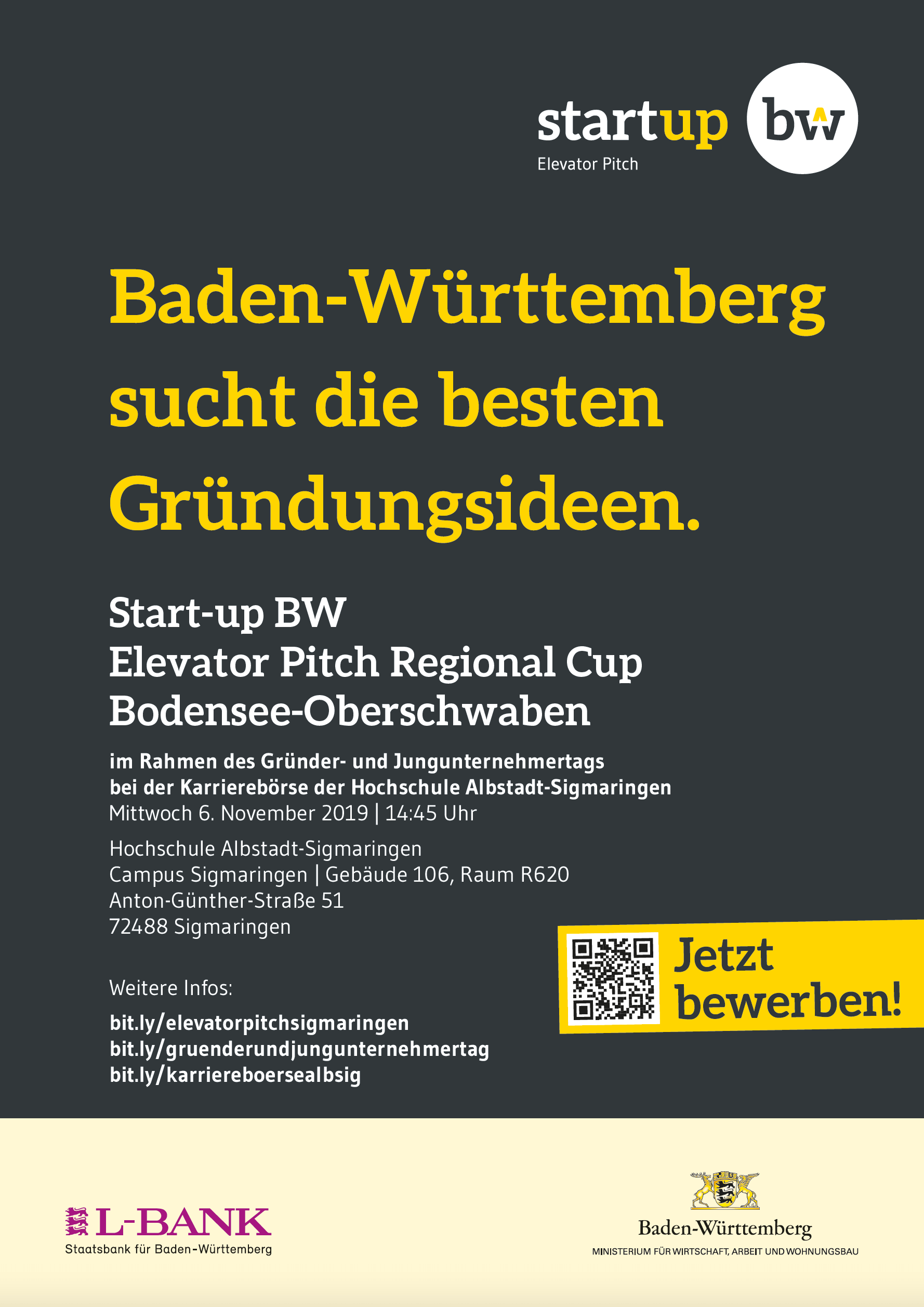 Jungunternehmer und Gründungsinteressierte haben am Mittwoch, 6. November, die einmalige Gelegenheit, ihre Geschäftsidee in Sigmaringen einer hochkarätig besetzten Jury vorzustellen und wertvolle Unterstützung für ihr Start-up zu erhalten. An der Hochschule Albstadt-Sigmaringen findet an diesem Tag neben der renommierten Karrierebörse auch der Start-up BW Elevator Pitch 2019 statt. Beginn ist um 14.45 Uhr auf der Empore in Gebäude 106. Die School of Entrepreneurship der Hochschule veranstaltet den Pitch gemeinsam mit der IHK Bodensee-Oberschwaben und dem Wirtschaftsministerium Baden-Württemberg. Er ist eingebettet in den Gründer- und Jungunternehmertag der IHK, der mit vielen weiteren Vorträgen und Erfahrungsberichten zu Gründungsthemen und Start-ups aus der Region aufwartet.